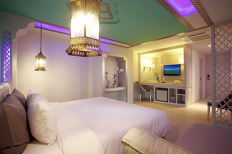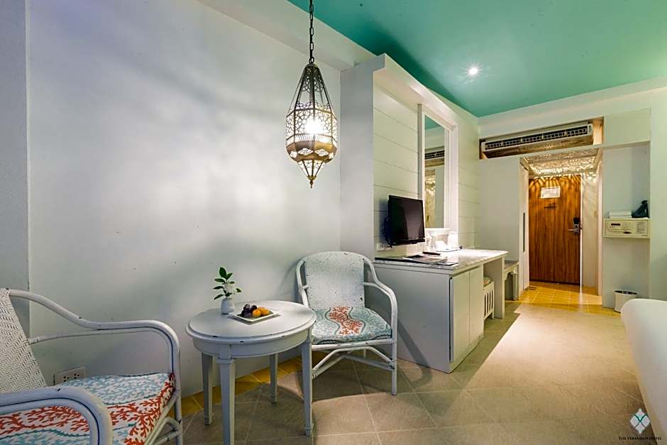 This family room features ceiling patterns, low hanging lampshades and a sofa. The cozy private balcony provides partial views of the Andaman sea. A flat-screen TV is included.